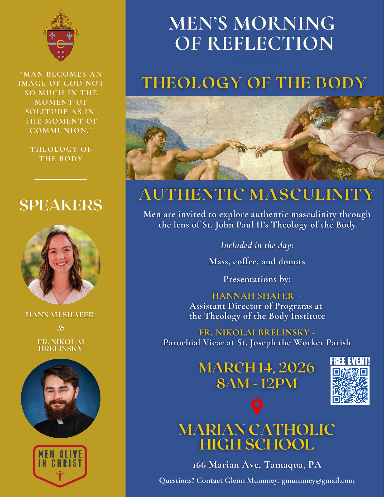A few months ago, I was asked if I would be willing to speak on the topic of Theology of the Body and masculinity at one of our diocesan high schools. I agreed, initially under the impression that I would be speaking to the male high school students. A few weeks later when the advertisement flyer was distributed, I realized my mistake: